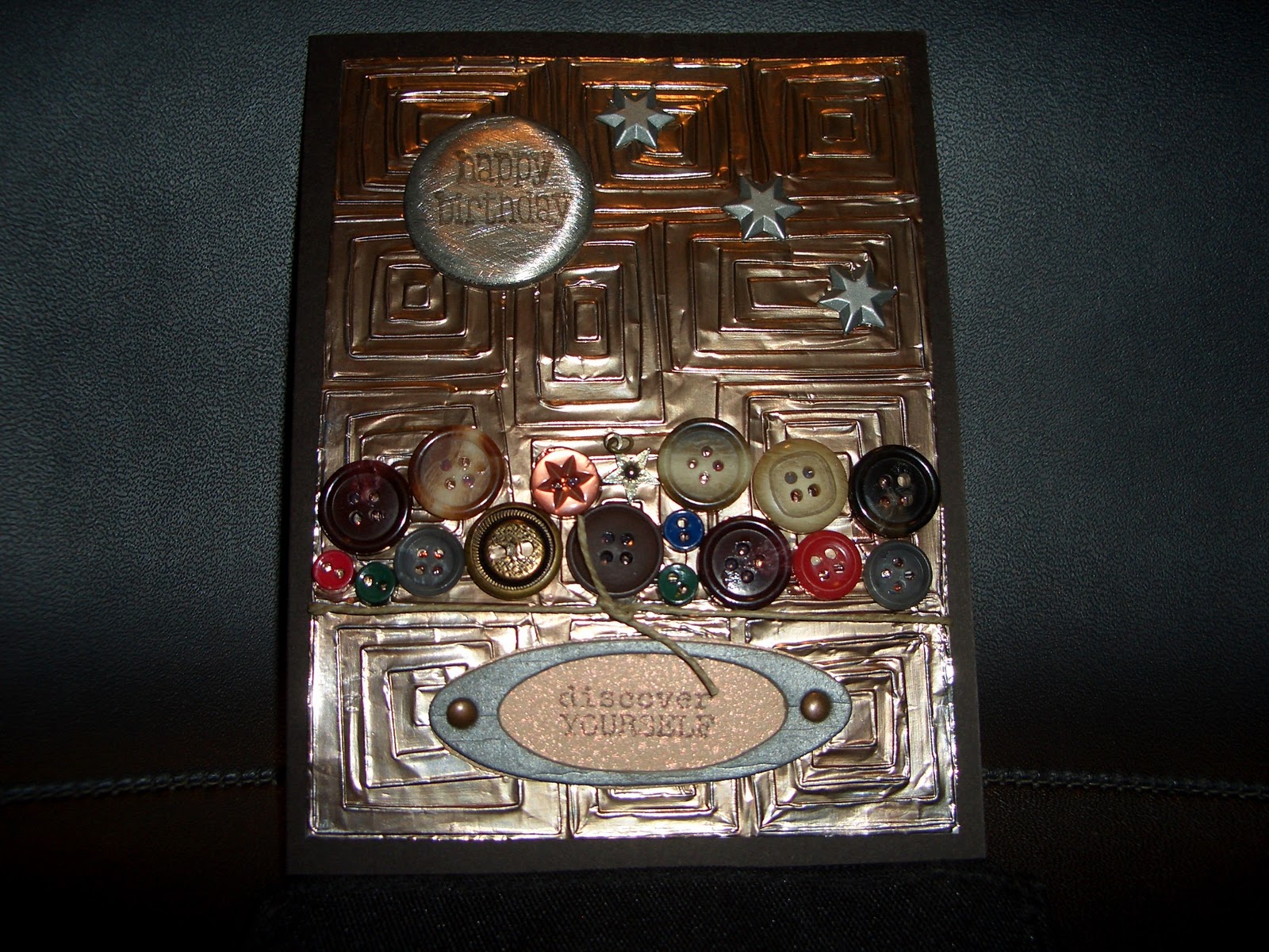 I usually need to make quite a few masculine cards. Here is one I made with a nephew in mind. I had read on Splitcoast Stampers that tin foil was used in a Cuttlebug embossing folder, and I loved how that looked. I tried it a little differently. I did put tin foil over a piece of cardstock and then I ran it through my Cuttlebug. I kept the tin foil in place on the cardstock and adhered it to the cardstock so it would retain the shape. This is the Cuttlebug embossing folder with the off centered rectangles. I then used a sponge dobber with WalnutStain Distress ink to give the foil a tint of color to age it a little. Then I tied a thin piece of twine around the card. I glued some old buttons on it with Glossy Accents glue. The big brad I sanded a little first and then I stamped the happy birthday with brown Stazon ink. The oval around the discover yourself sentient is grungeboard and I inked that up with Silver pigment ink. I used two copper brads to adhere it to the surface. I found the three star brads in my collection of brads. I think these stars came from Target in a star brad collection in their scrapbook isle. I then adhered the whole thing to a standard A2 size card. It's rather shiny to look at, but it looks burnished and masculine. Lots of fun!